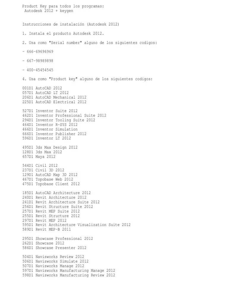 The letter changes with each release: The letter changes with each release: (b.) click on activate and if it'll tell you that your serial is wrong, merely click on. (a.) disable your net affiliation & antivirus, put off net and disable the antivirus. In this post, you can find all product keys for autodesk 2010, 2011, 2012 and 2013 products. The number stays the same for a given product:. Autodesk product keys consist of three numbers, a letter and the number one.